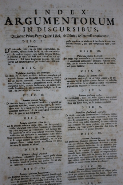 Jo. Baptistae || de Luca || VENUSINI || S. R. E. Presbyteri Cardinalis || Theatrum || veritatis, et justitiae || sive Decisivi discursus PER MATERIAS, SEU TITULOS || distincti, & ad veritatem editi in forensibus controversiis Canonicis || & Civilibus, in quibus in Urbe Advocatus, pro una partium seripsit, || vel consultus respondit. || LIBER QUINTUS || De regalibus, hoc est Officiis venalibus, locis montium, || aliisque juribus cum principe seu republica, vectigalibus & || gabellis, salinis & mineralibus, monetis, viis publicis, fisco || & aliis, de quibus [kursywa] in cap. unic. Qua fint Regalia. || [KURSYWA] CUM NONNULLIS RECENTISSIMIS SACRAE ROTAE || [kursywa] Romane Decisimibus ad materiam spectantibus, nec non Annotationibus, ac || Discursibus, qui annta in supplementis extabani, suis lais optimi adjectis. || [sygnet drukarski] || VENETIIS, MDCCXXXIV. || Ex Typographia Balleoniana. || [KURSYWA] SUPERIORUM PERMISSU, AC PRIVILEGIIS.