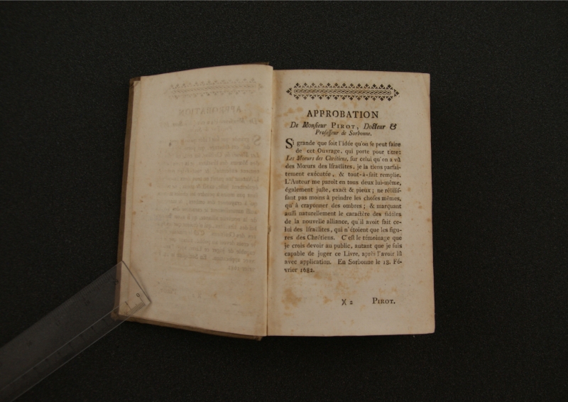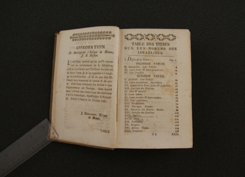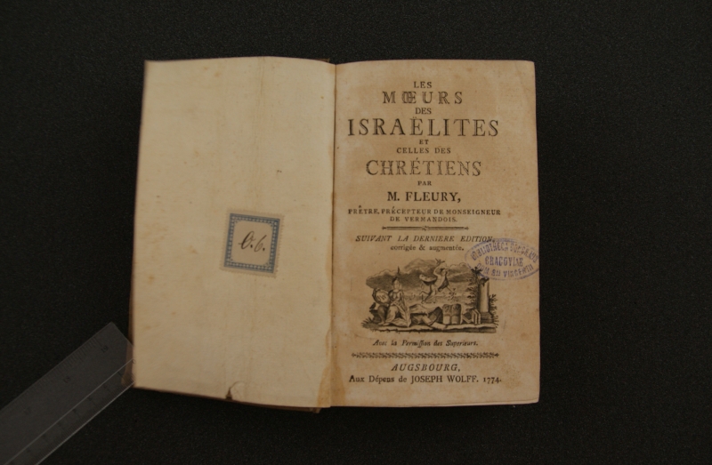 [antykwa:] LES MOEURS || DES ISRAËLITES || ET || CELLES DES || CHRETIENS || PAR || M. FLEURY, || PRETRE, PRECEPTEUR DE MONSIGNEUR || DE VARMANDOIS. || [linia ozdobna] || [kursywa:] SUIVANT LA DERNIERE EDITION, || [antykwa:] corriegee & augmentee. || [sygnet drukarski] || [kursywa:] Avec la Permi∫∫ion des Superieurs. || [linia ozdobna] || AUGSBOURG, || [antykwa:] Aux Depens de JOSEPH WOLFF. 1774.