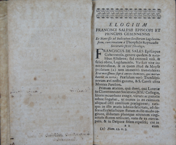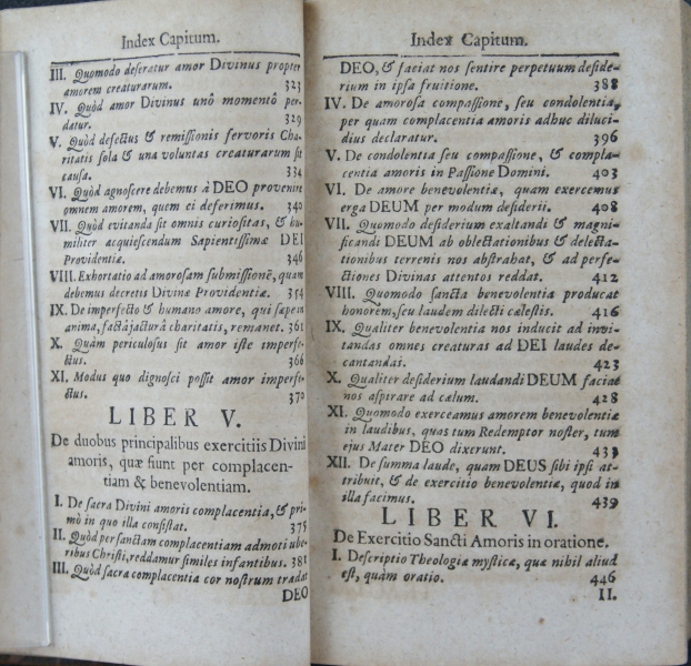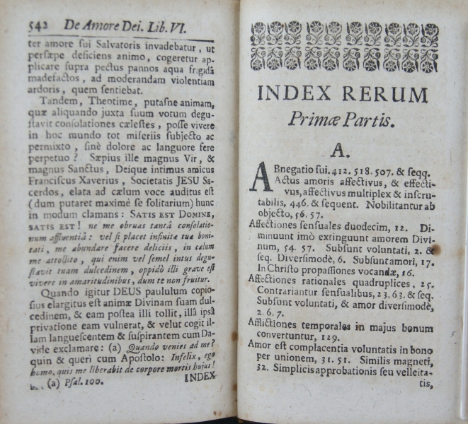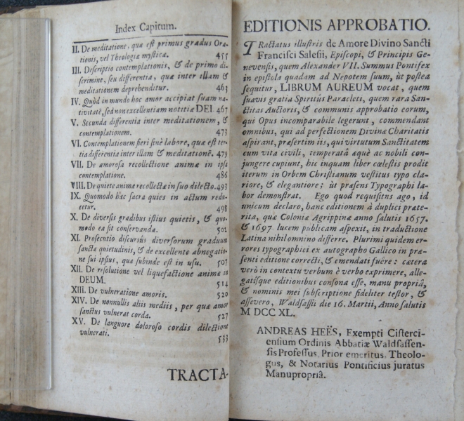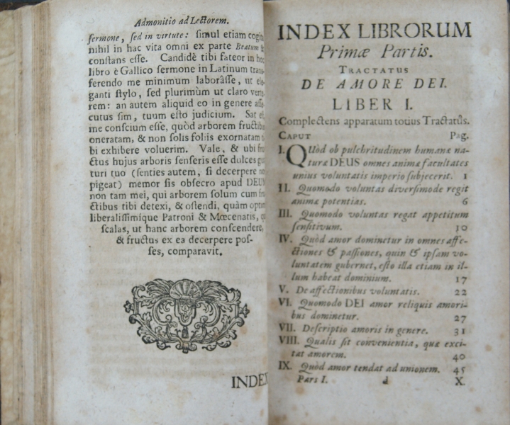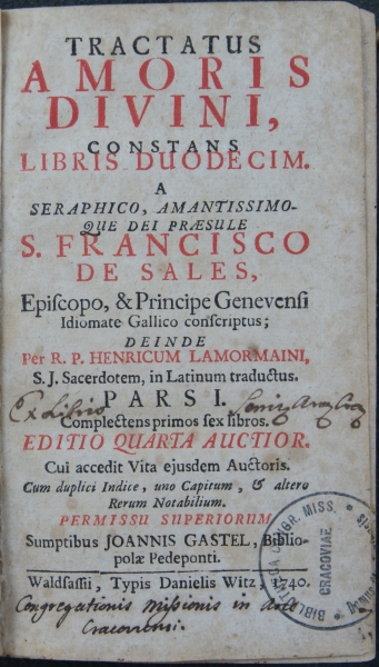 TRACTATUS || AMORIS DIVINI, || CONSTANS || LIBRIS DUODECIM. || A || SERAPHICO, AMANTISSIMO- || QUE DEI PRAESULE || S. FRANCISCO || DE SALES, || Epi∫copo, & Principe Geneven∫i || Idiomate Gallico con∫criptus; || DEINDE || Per R.P. HENRICUM LAMORMAINI, || S. J. Sacerdotem, in Latinum traductus. || PARS I. || Complectens primos ∫ex libros. || EDITIO QUARTA AUCTIOR. || Cui accedit Vita ejusdem Auctoris. || Cum duplici Indice, uno Capitum, & altero || Rerum Notabilium. || [kursywa:] PERMISSU SUPERIORUM || Sumptibus JOANNIS GASTEL, Biblio- || polae Pedeponti. || Wald∫a∫∫ii, Typis Danielis Witz, 1740.