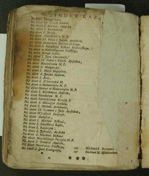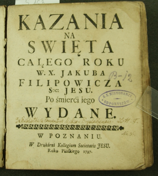 [antykwa] KAZANIA || NA || SWIĘTA || CAĻEGO ROKU || W.X. JAKUBA || FILIPOWICZA|| Soc: JESU. || Po śmierći iego || WYDANE. || [abstrakcyjny ornament pasowy] || W POZNANIU. || [kursywa] W Drukárni Kollegium Societatis JESU. || [antykwa] Roku Páń∫kiego 1737.