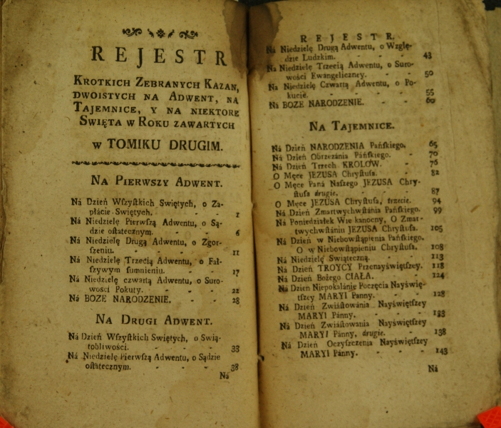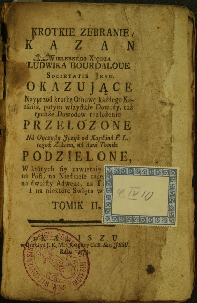 KROTKIE ZEBRANIE || KAZAŃ || WIELEBNEGO XIĘDZA || LUDWIKA BOURDALOUE || SOCIETATIS JESU. || OKAZUJĄCE || Nayprzod krotką Oſnowę każdego Ka- || zania, potym wſzyſtkie Dowody, toż || tychże Dowodow rozłożenie || PRZEŁOŻONE || [kursywa] Ná Oyczyſty Język od Kapłiná F.L. || tegoż Zakonu, ná dwa Tomiki || [antykwa] PODZIELONE, || W których ſię zawieraią [miejsce zasłonięte] || ná Poſt. na Niedziele całego [miejsce zasłonięte] || na dwoiſty Adwent, na Ta [miejsce zasłonięte] || i na niektóre Swięta w [miejsce zasłonięte] || TOMIK II. || w KALISZU || w Drukárni J.K.M. i Rzepltey Coll: Soc: JESU || Roku 1773.