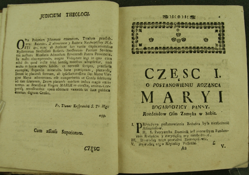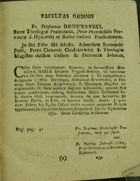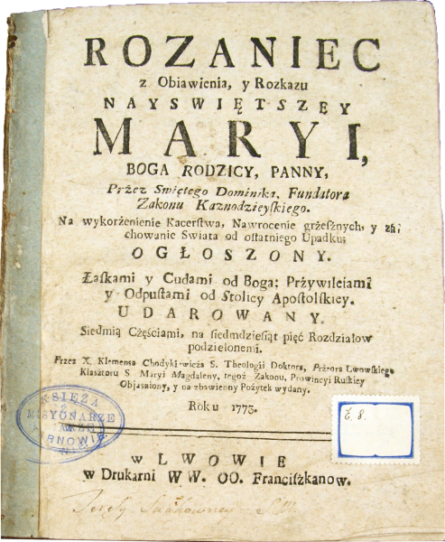 [antykwa] ROZANIEC|| z Obiawienia, y Rozkazu|| NAYSWIĘTSZEY || MARYI,|| BOGA [kursywa] R [antykwa] ODZICY, PANNY,|| [kursywa] Prżez Swiętego Dominika, Fundatora|| Zakonu Kaznodzieyʃkiego.|| [antykwa] Na wykorżenienie Kacerʃtwa, Nawrocenie grżeʃżnych, y za|| chowanie Swiata od oʃtatniego Upadku;|| OGŁOSZONY.|| Łaskami y Cudami od Boga: Prżywileiami|| y Odpuʃtami od Stolicy Apoʃtolʃkiey|| UDAROWANY.|| Siedmią Cżęściami, na ʃiedemdzieʃiąt pięć Rozdziałow|| podzielonemi.|| Przez X. Klemensa Chodykiewicza S. Theologii Doktora, [kursywa] P [antykwa] rżeora Lwowʃkiego|| Klasztoru S Maryi [kursywa] M [antykwa] agdaleny, tegoż Zakonu, Prowincyi Ruʃkiey|| Objasniony, y na zbawienny Pożytek wydany.|| Roku 1773.|| [linia] w LWOWIE|| w Drukarni WW.OO. Franciʃzkanow.||