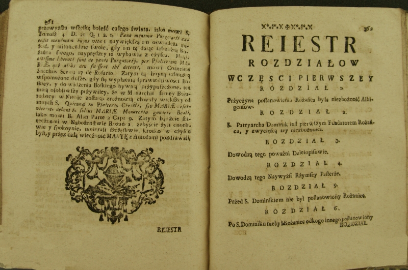 [antykwa] CZĘSC I. || O POSTANOWIENIU ROZANCA || MARYI || BOGARODZICY PANNY. || Rozdziałow Oʃm Zamyka w Sobie.