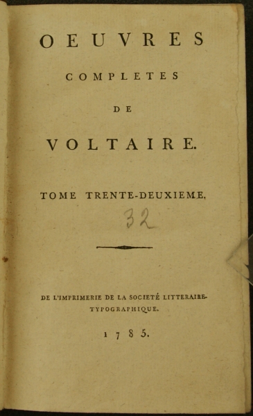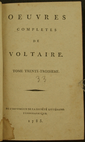 OEUVRES || COMPLETES || DE || VOLTAIRE. || TOME TRENTE-TROISIEME. || [ozdobnik] || DE L'IMPRIMERIE DE LA SOCIÉTÉ LITTÉRAIRE- || TYPOGRAPHIQUE. || 1785.
