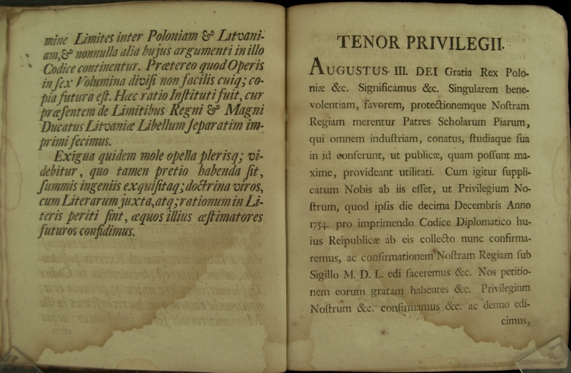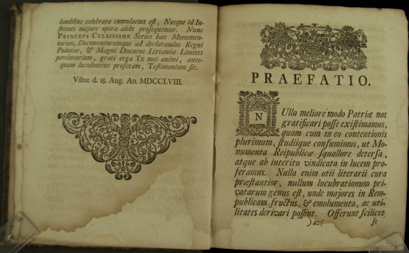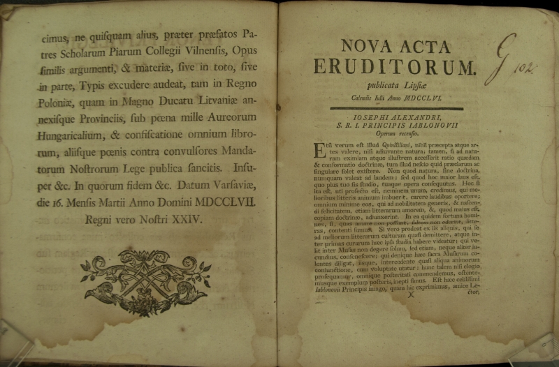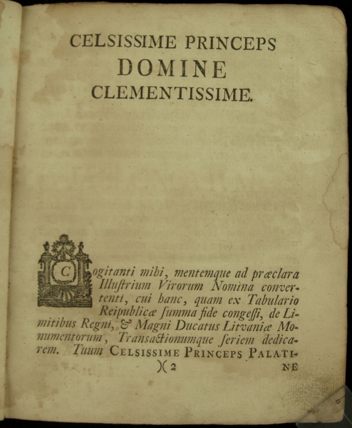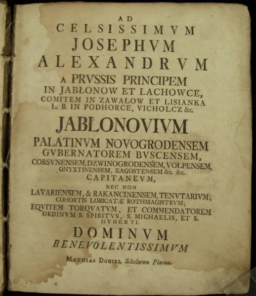 [czarna antykwa:] AD || CELSIIIIMVM || JOSEPHVM || ALEXANDRVM || A PRVSSIS PRINCIPEM || IN JABŁONOW ET LACHOWICE, || COMITEM IN ZAWAŁOW ET LISIANKA || L. B. IN PODHORCE, VICHOLCZ &Cc. || JABŁONOVIVM || PALATINVM NOVOGRODENSEM || GVBERNATOREM BVSCENSEM, || CORSVNENSEM, DZWINOGRODENSEM, VOŁPENSEM,|| ONYXTINENSEM, ZAGOSTENSEM &c. &c. || CAPITANEVM, || NEC NON || LAVARIENSEM, & RAKANCINENSEM, TENVTARIVM; || COHORTIS LORICATE ROTHMAGISTRVM; || EQVITEM TORQVATVM, ET COMMENDATOREM || ORDINVM S. SPIRITVS, S. MICHAELIS, ET S. || HVBERTI. || DOMINVM || [czarna kursywa:] BENEVOLENTISSIMVM || [antykwa:] MATHIAS DOGIEL [kursywa:] Scholarum Piarum.