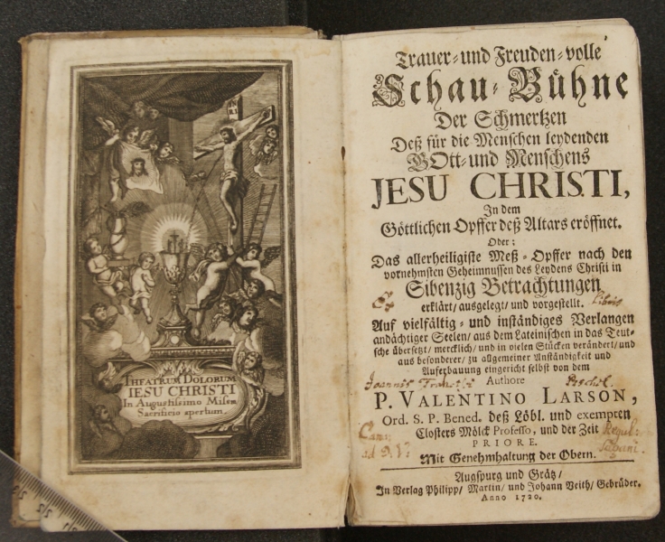 Pierwsze dzieło: [gotyk:] Trauer– und Freuden–volle || Schau–Bühne || Der Schmerzen || Deß für die Menschen lendenden || Gott und Menschens || [antykwa:] JESU CHRISTI, || [gotyk:] In dem || Göttlichen Opffer deß Altars eröffnet. || Oder: || Das alterheiligiste Meß – Opffer nach den || vornehmsten Geheimnussen des Lendens Christi in || Sibenzig Betrachtungen || erklärt / ausgelegt / und vorgestellt. || Auf vielfältig – und in ständiges Verlangen || andächtiger Seelen / aus dem Lateinischen in Das Teut– || sche übersetzt / mercklich / und in vielen Stücken verändert / und || aus besonderer / zu allgemeiner Anständigkeit und || Auferbauung eingericht selbst von dem || [antykwa:] Authore || P. VALENTINO LARSON, || Ord. S. P. Bened. [gotyk:] deß Löbl. und [antykwa:] exempt [gotyk:] en || Closters Mölck [antykwa:] Professo, [gotyk:] und der Zeit || [antykwa:] PRIORE. || [gotyk:] Mit Genehmhaltung der Obern. || [linia ciągła] || Augspurg und Gräß / || In Berlag Phillip / Martin / und Iohann Beith / Gebrüder. || [antykwa:] Anno 1720. Drugie dzieło: [gotyk:] Zwöllf || Wasser – und Gnaden – || reiche zu Elim gefundene || Brunnen. || Oder || Zwöllf geistreich – und auserlesene/ || von || [antykwa:] CHRISTO JESU || [gotyk:] Allen || Der Christlichen Gerechtig – und || Vollkommenheit begierig – und beflis – || senen Seelen/ || In dem || Allerheiligsten Sacrament des Al- || tars zur Nachfolg vorgetragene || Sitten – Lehren.