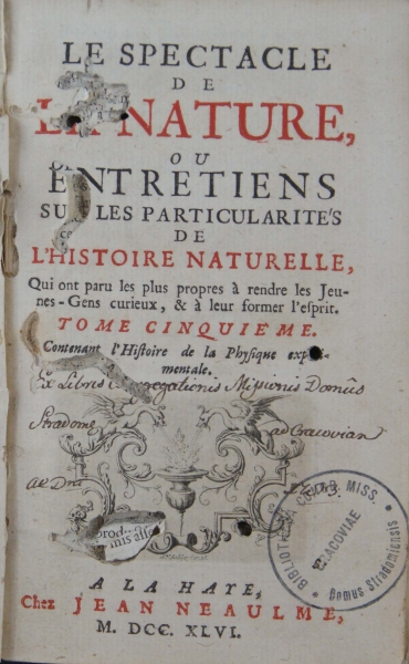 LE SPECTACLE || DE || [druk czerwony] L[A] NATURE, || [druk czarny] OU || ENTRETIENS || SU[R] LES PARTICULARITE'S || DE || [druk czerwony] L'HISTOIRE NATURELLE, || [druk czarny] Qui ont paru les plus propres à rendre les Jeu- || nes-Gens curieux, et à leur former l'eſprit. || [druk czerwony, kursywa] TOME CINQUIÈME. || [druk czarny, kursywa] Contenant l'Histoire de la Phyſique exp..i- || mentale. || [miedziorytowa winieta] || [kursywa] A LA HAYE, || [druk czerwony, antykwa] Chez JEAN NEAULME, || [druk czarny] M. CC. XLVI.