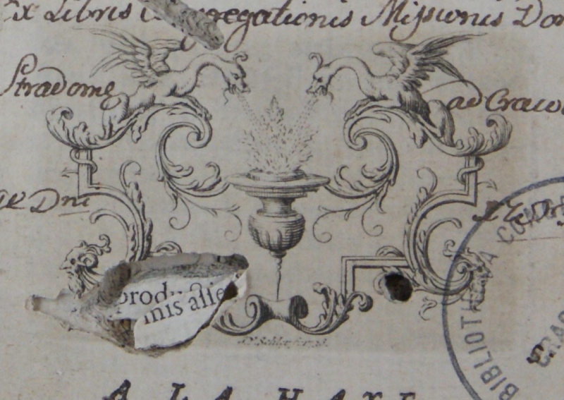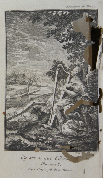 Miedzioryt. Motyw pasterza grającego na harfie. Opisany: Frontispice du Tome V. Pod odbitką podpis autora [F. de Bakeker], czytelna data: 1746. Poniżej: Qu'est-ce que l'Ho[mme?] Pseaume 8. Voyez l'explic fin de ce Volume.