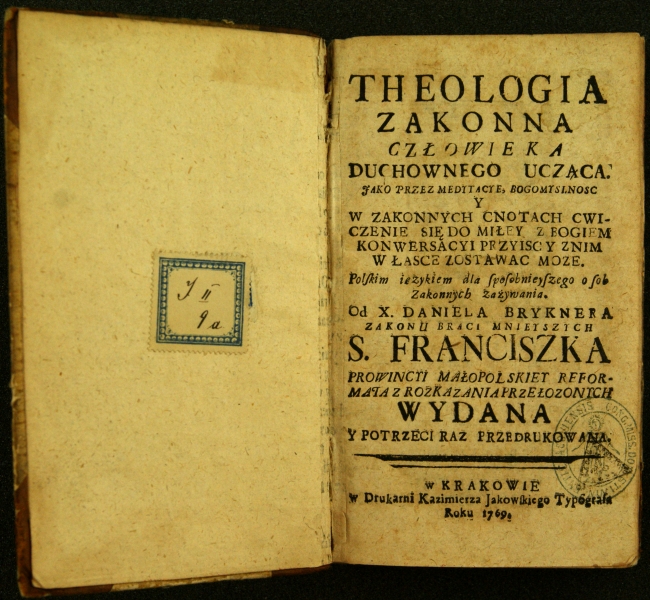 THEOLOGIA|ZAKONNA| (kursywa)CZŁOWIEKA| (antykwa)DUCHOWNEGO UCZĄCA.| JAKO PRZEZ MEDYTACYE, BOGOMYSLNOSC| Y| W ZAKONNYCH CNOTACH CWI-| CZENIE SIĘ DO MIŁEY Z BOGIEM| KONWERSACYI PRZYISC Y ZNIM| W ŁASCE ZOSTAWAC MOZE.| (kursywa)Polskim językiem dla sposobnieyszego osob| Zakonnych zażywania.|(antykwa)Od X. DANIELA BRYKNERA| ZAKONU BRACI MNIEYSZYCH| S. FRANCISZKA| (kursywa)PROWINCYI MAŁOPOLSKIEY REFOR-| MATA Z ROZKAZANIA PRZEŁOZONYCH| (antykwa)WYDANA| Y POTRZECI RAZ PRZEDRUKOWANA.| w KRAKOWIE| w Drukarni Kazimierza Jakowskiego Typografa| Roku 1769.