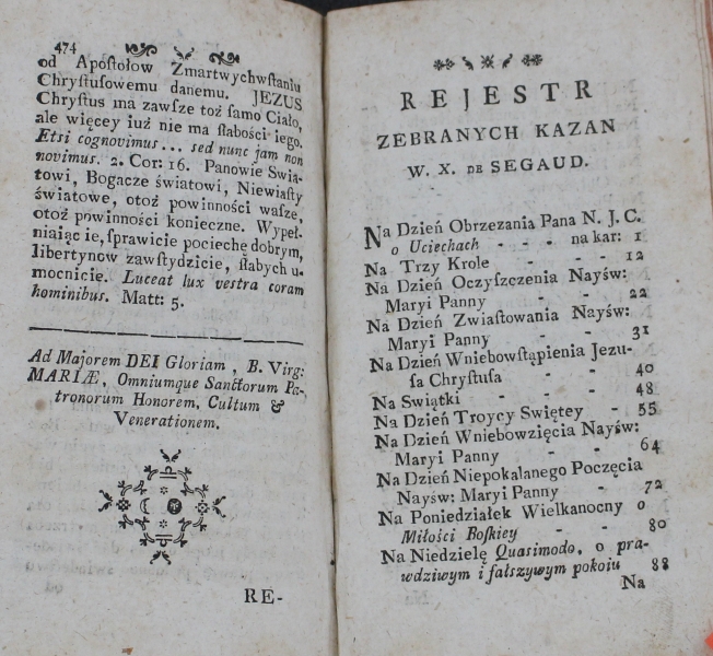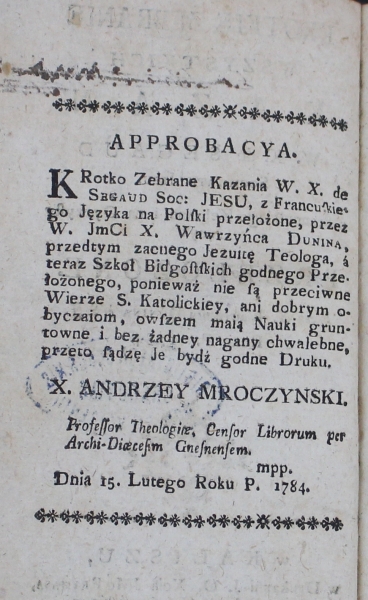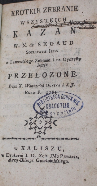 KROTKIE ZEBRANIE || WSZYSTKICH || KAZAN || W. X. de SEGAUD || [kapitaliki] Societati Jesu. || [antykwa] z Francuſkiego Zebrane i na Oyczyſty || Język || PRZEŁOZONE. || [kursywa] Przez X. Wawrzeńca [proste kapitaliki] Dunina [kursywa] è S. J. || [proste kapitaliki] Roku P. 1784. || [ornament] || w KALISZU, || w Drukarni J. O. Xcia JMc [kapitaliki] Prymasa, || [antykwa] Arcy-Biskupa Gnieźnieńſkiego.