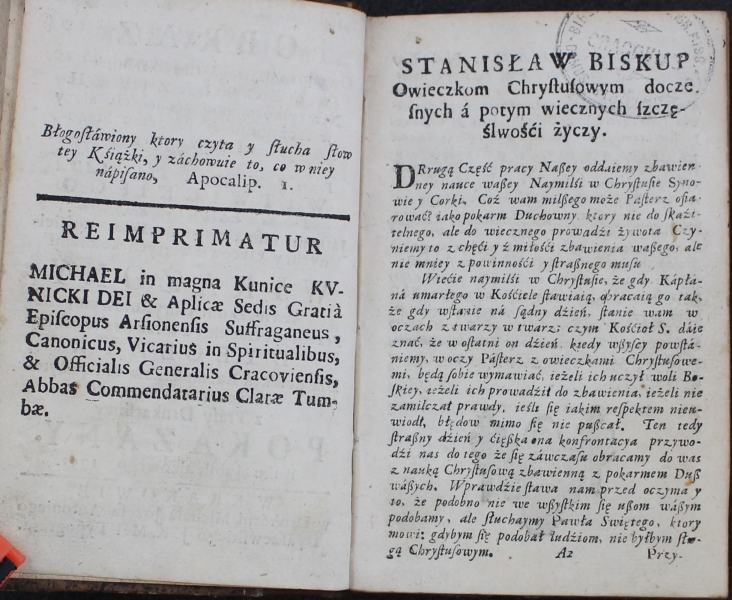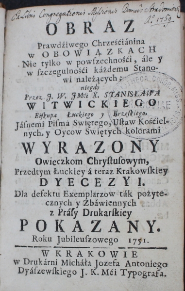 OBRAZ || Prawdźiwego Chrześćianina || w OBOWIĄZKACH || Nie tylko w powſzechnośći, ále y || w ſzczegulnośći káżdemu Stano- || wi należących; || [kursywa] niegdy || Przez J. W. Jmći X. STANISŁAWA || [antykwa] WITWICKIEGO || [kursywa] Biſkupa Łuckiego y Brzeſkiego, || [antykwa] Jáſnemi Piſma Swiętego, Uſtaw Kośćiel- || nych, y Oycow Swiętych kolorami || WYRAZONY || Owieczkom Chryſtuſowym, || Przedtym Łuckiey á teraz Krakowſkiey || DYECEZYI. || Dla defektu Exemplarzow ták pożyte- || cznych y Zbáwiennych || z Praſy Drukarſkiey || POKAZANY. || Roku Jubileuszowego 1751. || [linia] || W KRAKOWIE || w Drukárni Micháła Jozefa Antoniego || Dyáſzewſkiego J. K. Mći Typografa.