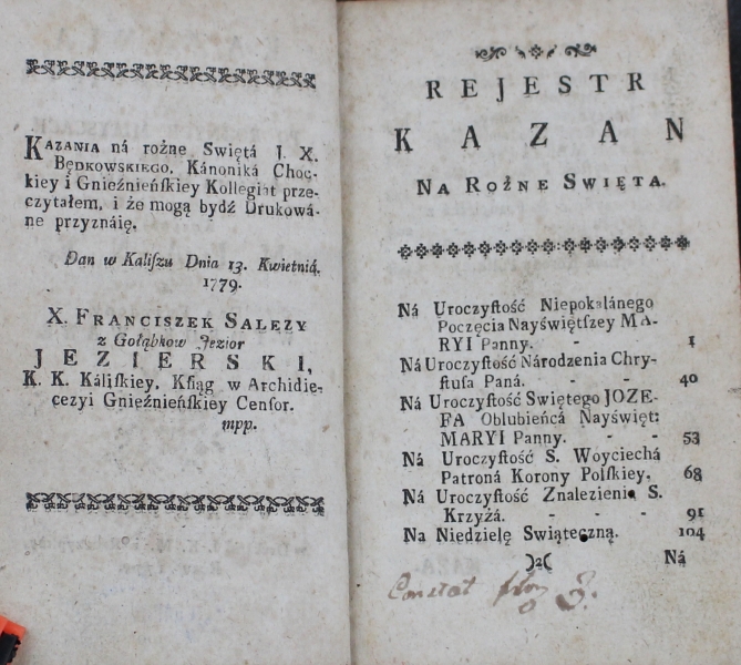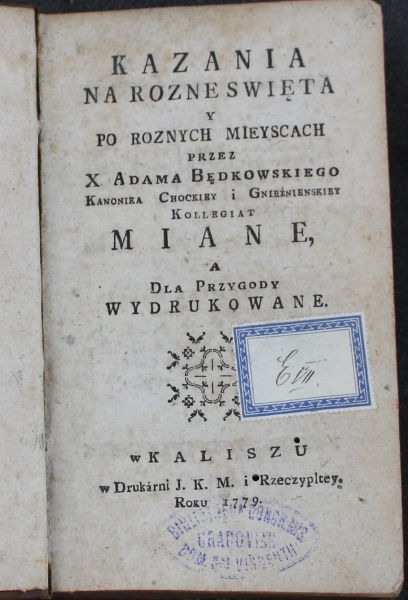KAZANIA || NA ROZNE SWIĘTA || Y || PO ROZNYCH MIEYSCACH || [kapitaliki] przez || X. Adama Będkowskiego || Kanonika Chockiey I Gnieźnienskiey || Kollegiat || [antykwa] MIANE || A || [kapitaliki] Dla Przygody || [antykwa] WYDRUKOWANE. || [winieta złożona z ozdobników typograficznych] || w KALISZU || w Drukárni J. K. M. i Rzeczypltey. || Roku 1779.