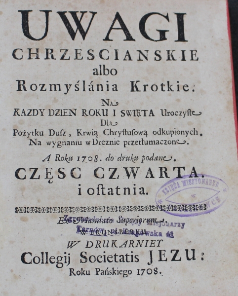 UWAGI ǀǀ CHRZESCIJANSKIE ǀǀ albo ǀǀ Rozmyślánia Krotkie. ǀǀ NA ǀǀ WSZYTKIE DNI ROKU, I SWIĘTA Uroczyste ǀǀ Dla ǀǀ Pożytku Duʃz, krwią Chryʃtuʃową odkupionych. ǀǀ Na wygnániu w Dreznie przetłumáczone. ǀǀ (kurs.)A Roku 1708. do druku podane. ǀǀ CZĘSC CZWARTA. ǀǀ i oʃtatnia. ǀǀ [dekoracyjna linia] ǀǀ Ex Mandato Superiorum. ǀǀ W BRUNSBERKU ǀǀ (kurs.) W DRUKARNIEY ǀǀ Collegij Societatis JESU : Roku Pańskiego.